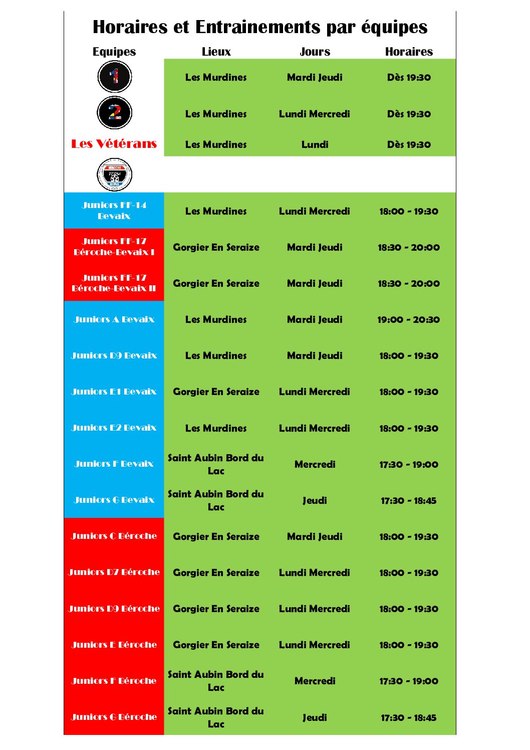 Planning des entrainements